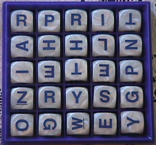 Boggle consists of 25 dice, each of which have different letters on the six faces (one face of one die has a "Qu"). The dice are rolled, and placed at random in a 5x5 grid, so that they look like this: