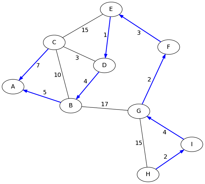 Vertex G gets visited, its parent is F, and its 4 neighbors go in the fringe.visited: A, B, C, D, E, F, G parents: A->null, B->A, C->A, D->B, E->D, F->E, G->F fringe: (G,B,22), (B,C,17), (E,C,22), (C,E,25), (E,F,16), (B,G,32), (F,G,17), (H,G,30), (I,G,19)