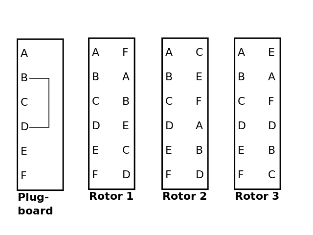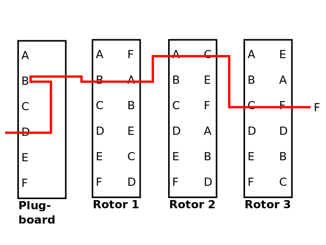 At this point, it may seem that this is just a substitution cypher, just an unnecessarily complex one. Well, after encrypting this 'D', Rotor 3 is rotated one slot (in the below picture, notice how in the third rotor, 'A' no longer maps to 'C' - instead, it now maps to 'E', which is the letter 'B' used to map to. In other words, each letter in the right column has moved up one spot). So, when we encrypt 'D' again, we get a different encrypted character.