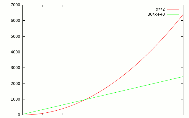 What happens if we change the constants in \(g(n)\)? The line moves, but it doesn't change shape, so there's always some point at which f(n) passes it. Here for example is \(f(n)= n^2\) vs. \(g(n) = 30n+40\).