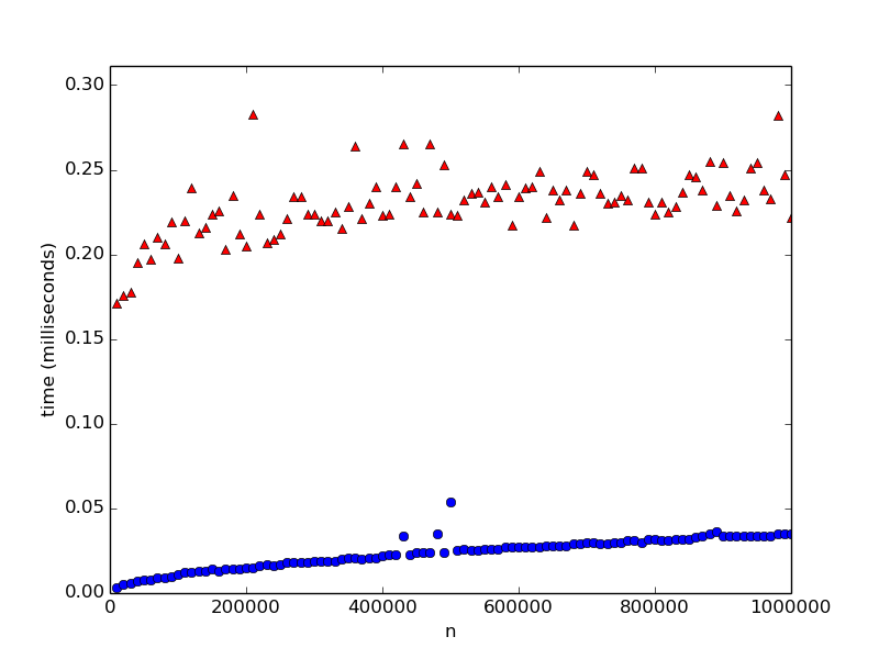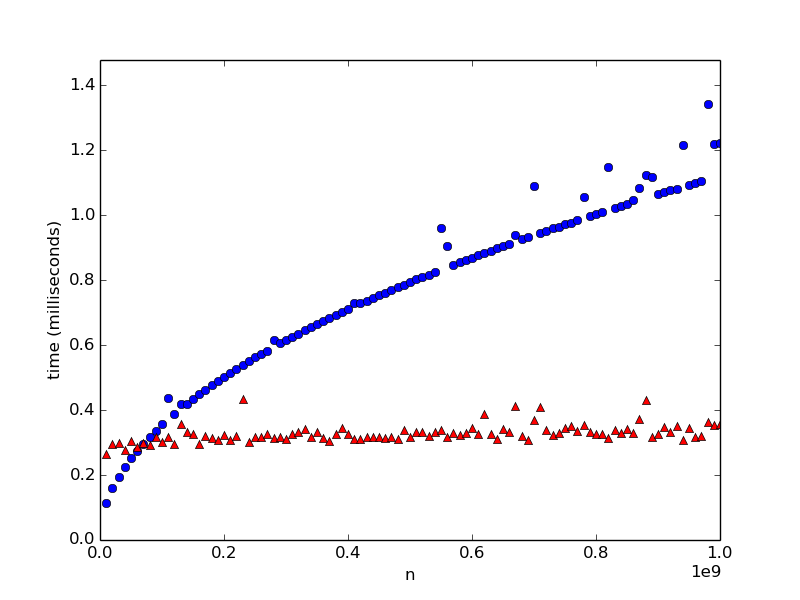 Now what do you think? Which one is faster? Are you sure? What if we test on some larger numbers, i.e. stretch this graph out further to the right? Here's one where \(n\) goes to about 1 billion:
