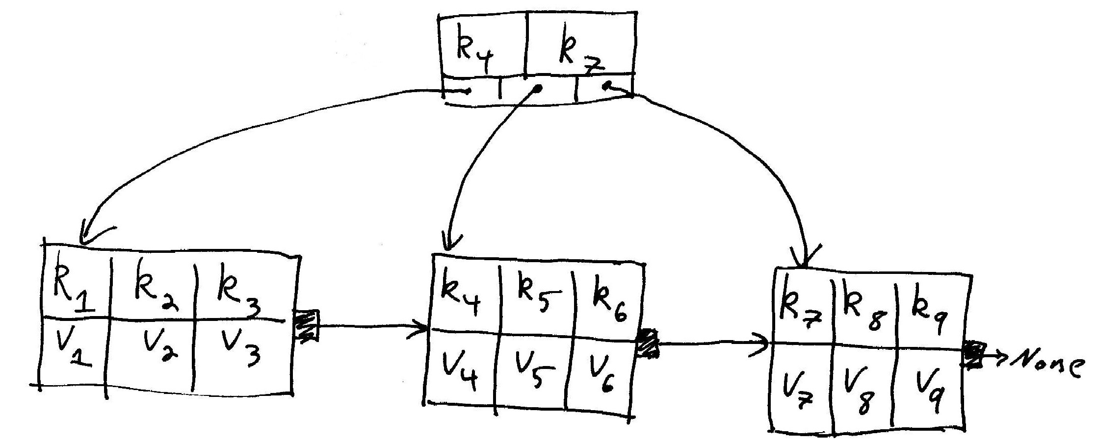 What's with the arrows between the leaves? Many database queries are along the lines of "give me every value associated with a key within the range (some key-some other key)." This is why leaves are large: the hard drive needs to seek to the first element of the block (slow), but then can read off each of these consecutive values one after another (fast), since they are physically right next to each other on disk. But what if the range extends past the end of a leaf? Well, here, each leaf contains a pointer to the next leaf, like a linked list. This allows the hard drive to move to the next block without having to re-navigate the tree.