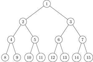 It turns out, though, that when working with a complete tree, it is unnecessary to actually make the TreeNode class and store this as a tree. Instead, we'll use the tree image to help us see what's going on, while actually storing the priority/element pairs in an array. Consider the complete tree below. In this case, the numbers are NOT the data within the nodes; instead, they are the indices of the corresponding array. We keep nothing in index 0 (for convenience), the root in spot 1, its child in index 2, its other child in index 3, and so on. This is convenient, because now if a node is stored in index i, its left child is in 2i, and its right child is in 2i+1. Its parent, due to the magic of integer math, is in i/2.