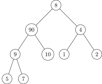 However, to remove the max you have to actually change the heap. Insertion involved a bubble-up, so as you might guess removal requires a bubble-down. To do a removeMax(), you take the last element in the tree (in our example, after the insertion of 90, this is 8), and put it as the root. Then,