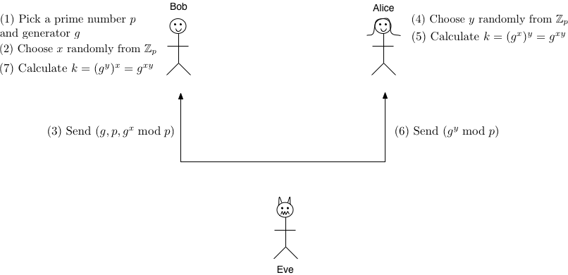 See how it works? The main idea is that Bob can compute \(k=x^{ab}\) because he knows \(x^a\) and \(b\), and similarly Alice can compute \(k=x^{ab}\) because she knows \(x^b\) and \(a\), but Eve only sees the values of \(x\), \(x^a\), and \(x^b\), so she's stuck!