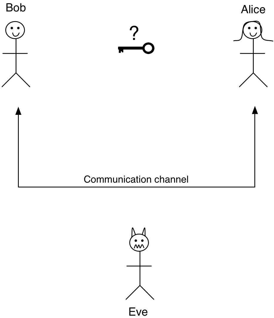 Suppose two people, Alice and Bob, want to communicate with each other over an insecure channel Examples of an insecure channel might be writing on a public message board, or sending email, or Starbucks wireless, or really any kind of Internet communication that's not HTTPS. Alice and Bob want to be sure that a third party listening to their transmissions, Eve (the evil eavesdropper), won't be able to understand what they are saying.