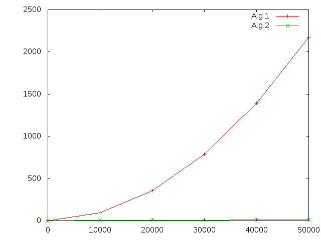 Both get slower as n increases, but algorithm 1 gets worse faster. Why does algorithm 1 suck?