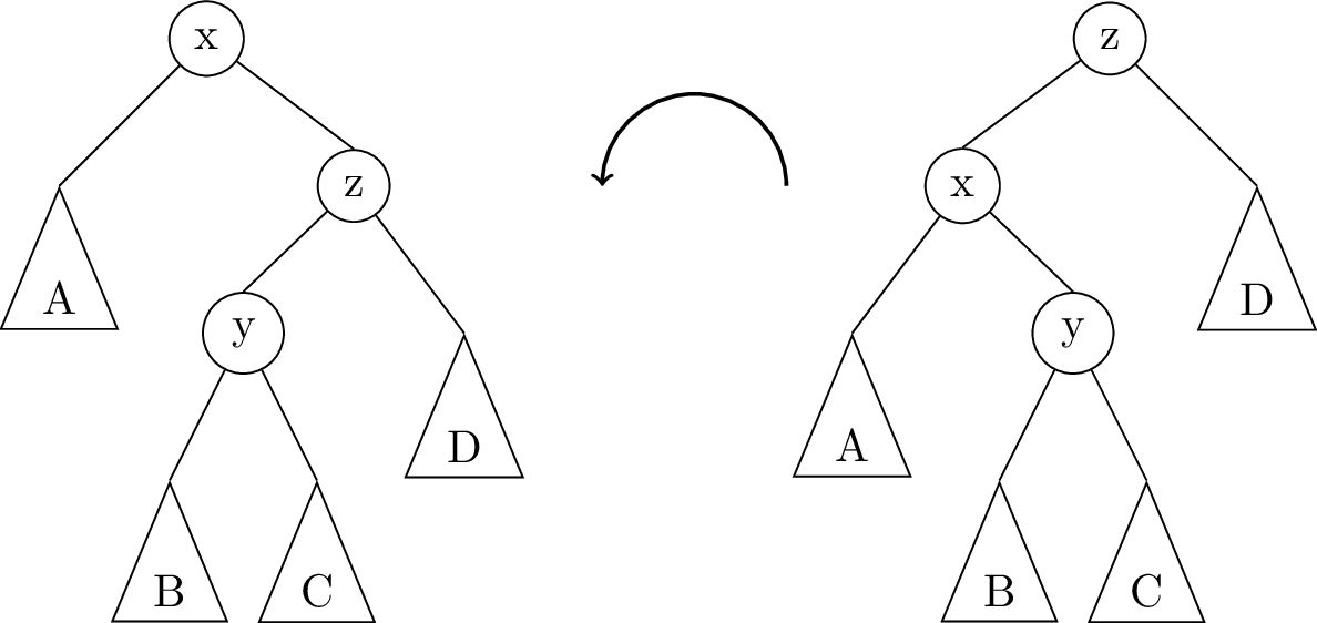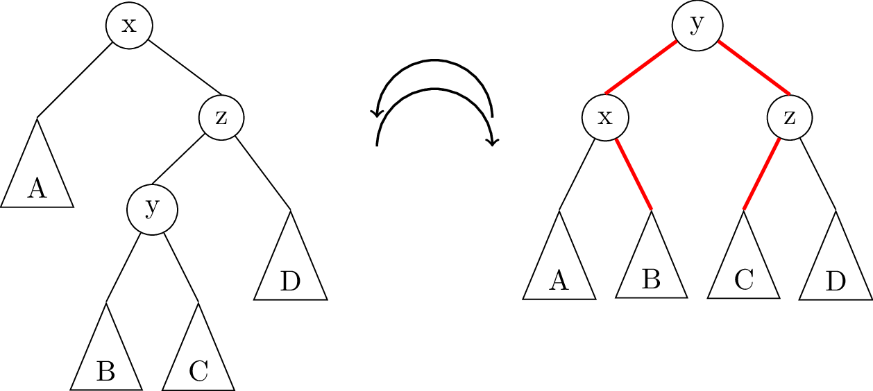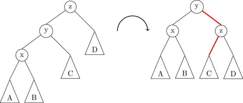 In this illustration, the triangles A, B, C, D represent subtrees which might be empty (null), or they might contain 1 node, or a whole bunch of nodes. The important thing is that the subtrees don’t change, they just get moved around. In fact, there are only really two links that get changed in a rotation; they are highlighted in red in the image above.