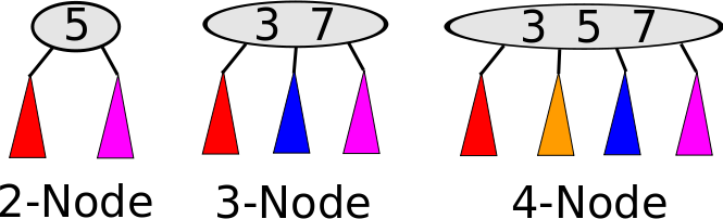 In the above image, in the 2-node, the red subtree consists of data smaller than 5, and the purple data consists of data larger than 5. In the 3-node, red data is smaller than 3, blue is between 3 and 7, and purple is larger than 7. In the 4-node, red is smaller than 3, yellow is between 3 and 5, blue is between 5 and 7, and purple is larger than 7. In summary: