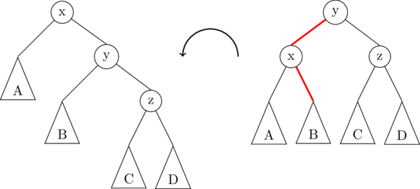 The following illustration demonstrates a left rotation on the root node, x: