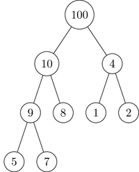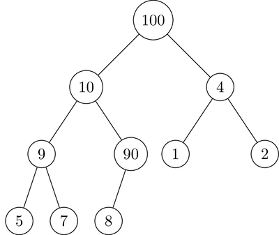 peekMax()is also \(O(\log n)\)since we just have to go to the rightmost node in the tree, andremoveMax()` has the same big-O cost of \(O(\log n)\).But using a balanced search tree here is kind of overkill. These trees are complicated and their implementations are tricky, in order to support quickly looking up anything in the tree, not just the largest element. If only we had some kind of balanced tree that was organized according to the maximum rather than the sorted order…