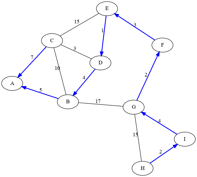 In fact, if we were to keep running, we would have found all of the shortest paths from A. The parent pointers encode a tree that gives the fastest path from A to any other node in the graph. Here they are drawn in blue: