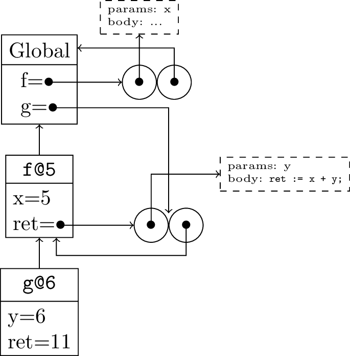 Each function in a frame will now just be a pointer to a closure, which in turn points to another frame. The result can be very simple, or we can get some really interesting and gnarly diagrams. We might affectionately call these “boxes and balls” diagrams, since each frame is drawn in a box, and each closure is drawn as a pair of circles.
