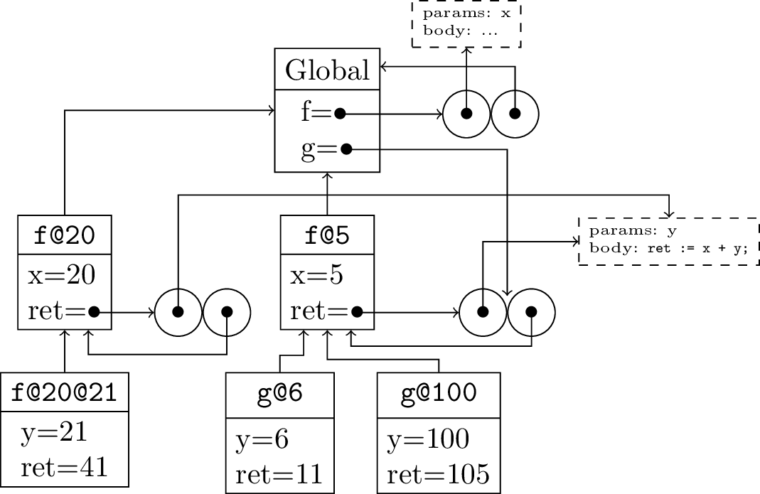 - Each function definition creates a new closure. The referencing environment of the closure is the frame in which the function is defined.