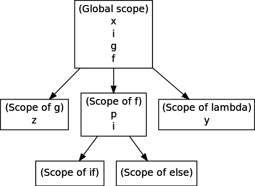 fis only in the tree once, even though f will get called twice in an actual run. The scope tree has nothing to do with the run-time of the program, just with its lexical structure. - There is a scope for the body of the