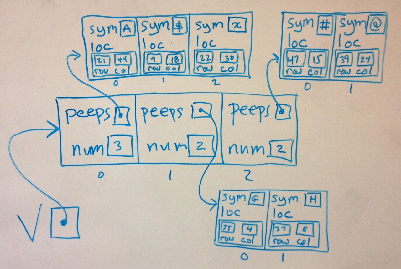 Vassigned and initialized as in the picture.struct pos { int row; int col; }; struct guy { char sym; struct pos loc; }; struct group { struct guy* peeps; int num; };